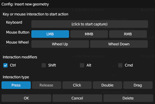 ✕ to delete that interaction.+ Add New Keymap to add a new interaction for the action.Reset Keymap button to reset that action’s keymaps to the default interactions.Reset All button at the bottom to reset all of the custom keymaps back to their default interactions.